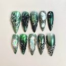 Dare to go dark with Nocturne Glitch! Featuring deep black chrome with green iridescent reflections, this press-on nail set is a futuristic gothic masterpiece with abstract silver detailing.
